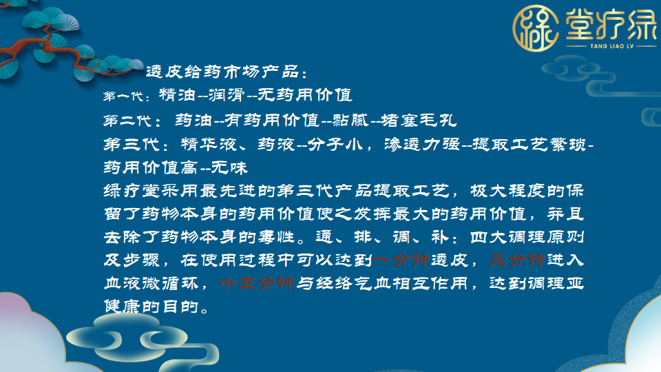 綠療堂產(chǎn)品結(jié)構(gòu)豐富多樣,根據(jù)每一種亞健康不同的生理表現(xiàn)再加之組方的必要性,在提取工藝上對(duì)應(yīng)了每一個(gè)組方藥性藥理的配伍。采用科學(xué)的方式讓其藥性藥理通過(guò)不同的產(chǎn)品形態(tài)作用于不同的位置,發(fā)揮其最大的優(yōu)勢(shì)和獨(dú)特的作用。十余種不同形態(tài)的透皮給藥技術(shù)和產(chǎn)品形態(tài)( 儀器、推拿技術(shù)、精華液、藥液熏蒸、藥油、精油、藥膏、藥粉、藥浴、核心技術(shù)藥貼、灸、藥泥)+藥食同源的口服產(chǎn)品等綜合項(xiàng)目外調(diào)內(nèi)補(bǔ),標(biāo)本兼治有效率穩(wěn)定在90%以上,降低組方難度的同時(shí)降低操作人員的操作時(shí)間。