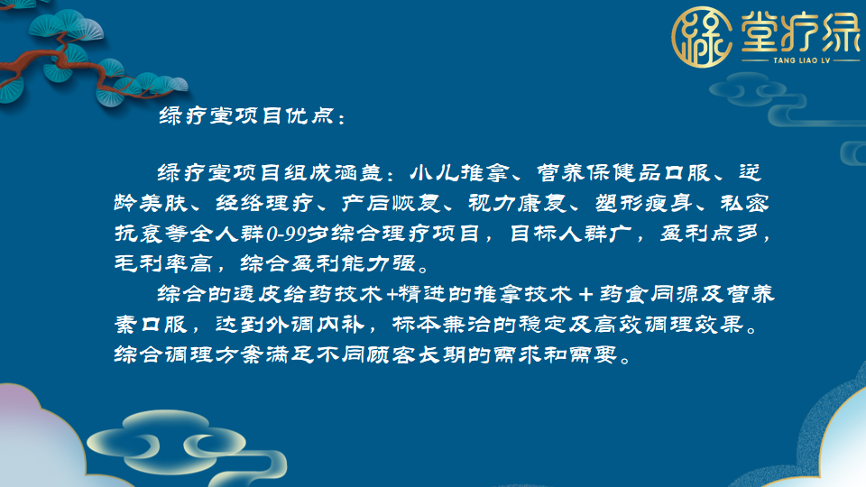 綠療堂項(xiàng)目組成涵蓋:小兒推拿、營(yíng)養(yǎng)保健品口服、運(yùn)齡美膚、經(jīng)絡(luò)理療、產(chǎn)后恢復(fù)、視力康復(fù)、塑形瘦身、私密抗衰等全人群0-99歲綜合理療項(xiàng)目,自標(biāo)人群廣,盈利點(diǎn)多,毛利率高,綜合盈利能力強(qiáng)。綜合的透皮給藥技術(shù)+精進(jìn)的推拿技術(shù)+藥食同源及營(yíng)養(yǎng)素口服,達(dá)到外調(diào)內(nèi)補(bǔ),標(biāo)本兼洽的穩(wěn)定及高效調(diào)理效果。綜合調(diào)理方案滿足不同顧客長(zhǎng)期的需求和需要。