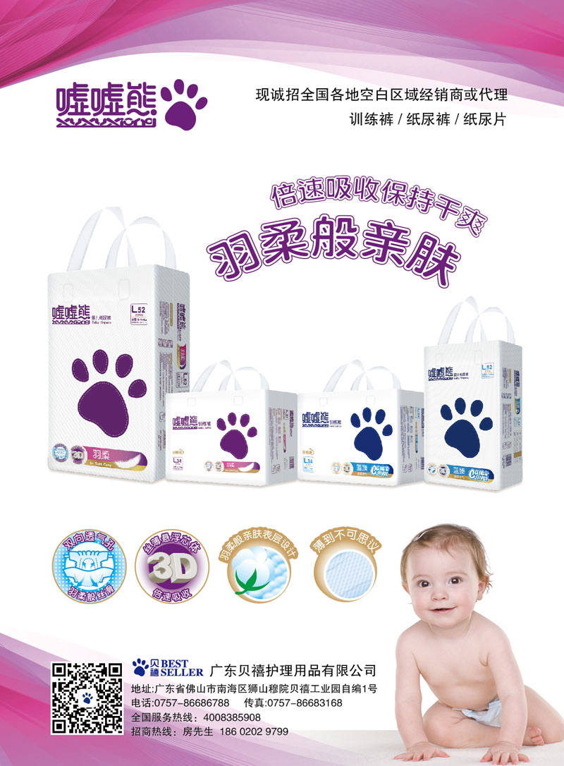 噓噓熊是廣東貝禧護(hù)理用品有限公司旗下的嬰幼兒紙尿褲品牌,有紙尿片、紙尿褲、拉拉褲三大系列。噓噓熊紙尿褲擁有棉柔表層+透氣底膜,可以有效排出悶熱濕氣,保持屁屁干爽舒適。臻薄芯體設(shè)計(jì),不起坨、不斷層;強(qiáng)力SAP高分子吸水珠珠,能夠快速吸收不回滲,讓寶寶小屁屁時(shí)刻健康舒適。