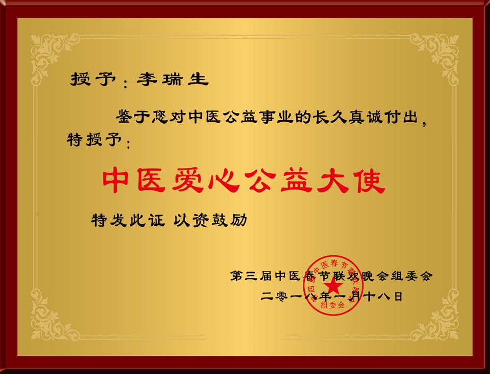 ◆2019年1月18日,第四屆中醫(yī)春節(jié)聯(lián)歡晚會眾道妙方董事長李瑞生榮獲“中醫(yī)愛心公益大使”