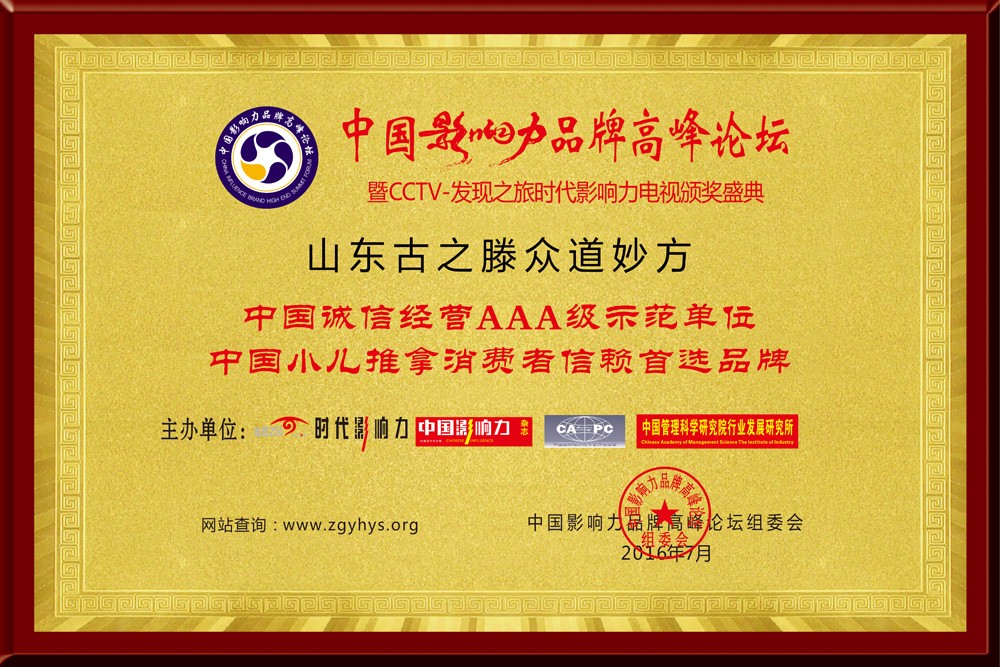 ◆2017年榮獲“中國誠信經(jīng)營AAA級示范單位” “中國小兒推拿消費者信賴首選品牌