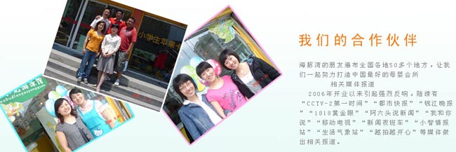 06年杭州第一家兒童專(zhuān)業(yè)理發(fā)服務(wù)機(jī)構(gòu)開(kāi)張營(yíng)業(yè),經(jīng)過(guò)4年的發(fā)展成為杭州嬰幼兒服務(wù)最大最專(zhuān)業(yè)連鎖機(jī)構(gòu)之一,迄今為止已經(jīng)在全國(guó)各地?fù)碛?0多家合作店,第一家引進(jìn)來(lái)自太空的水處理系統(tǒng)--美國(guó)中央軟水處理系統(tǒng),第一家引進(jìn)開(kāi)發(fā)了適合1到6歲寶寶的幼兒游泳項(xiàng)目,第一家擁有正規(guī)游泳師證書(shū)的嬰兒游泳館,第一家擁有嬰兒沖浪游泳的游泳館,第一家使用恒溫設(shè)備的游泳館。經(jīng)過(guò)幾年的發(fā)展,讓我們更懂得珍惜和感恩,愛(ài)孩子像愛(ài)自己的寶貝!