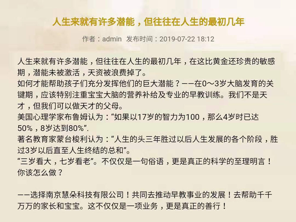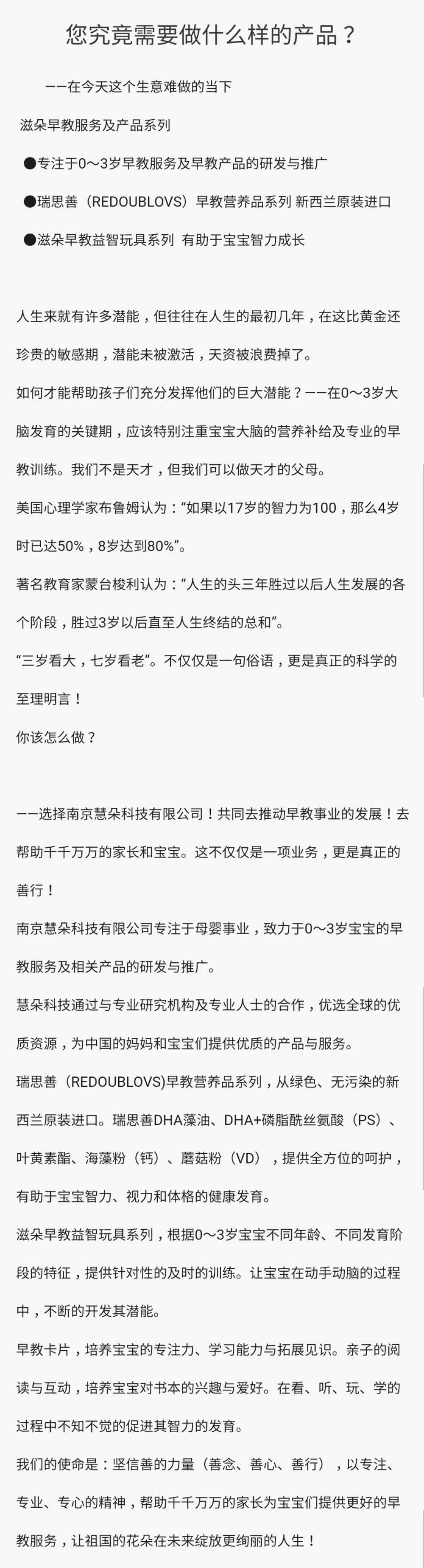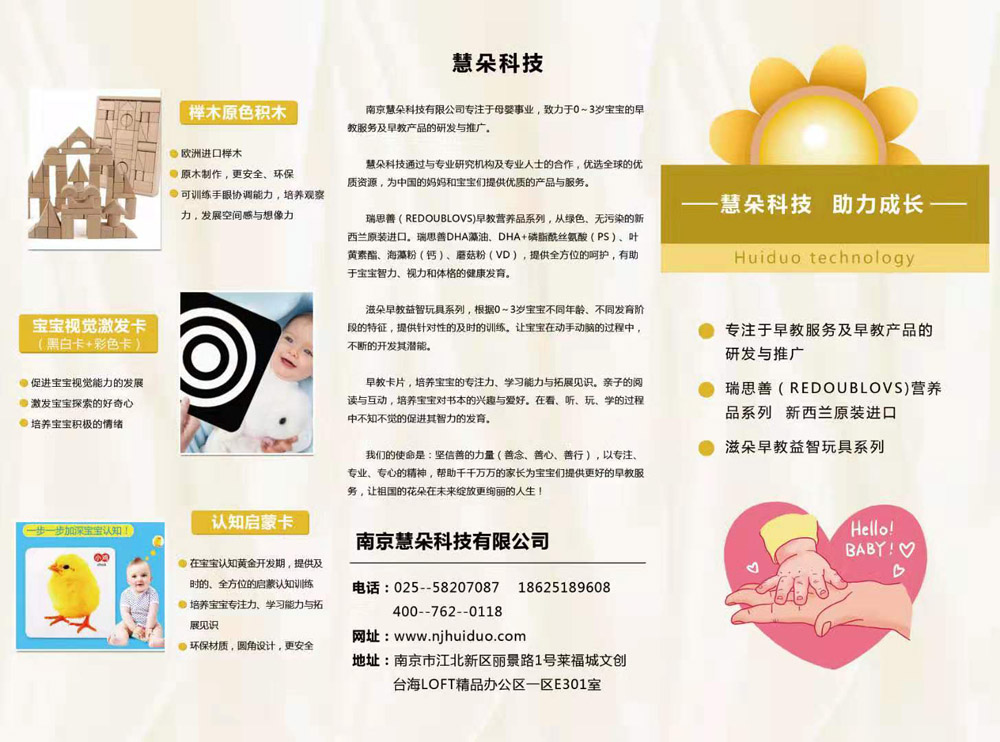 南京慧朵科技有限公司專(zhuān)注于母嬰事業(yè),致力于0~3歲寶寶的早教服務(wù)及相關(guān)產(chǎn)品的研發(fā)與推廣。