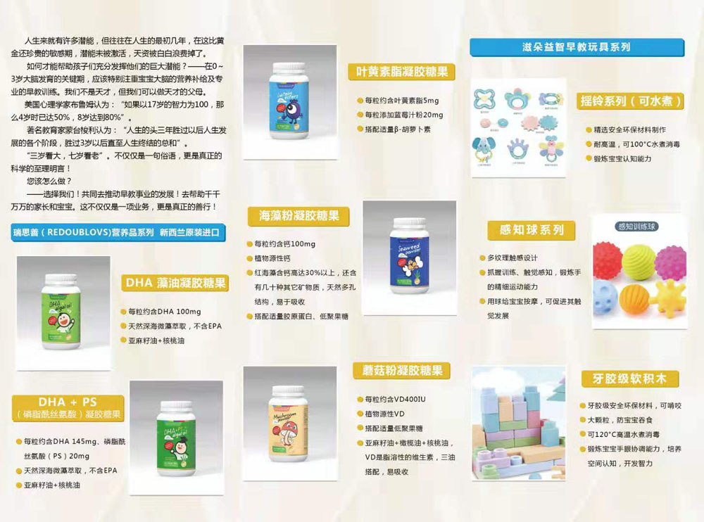 瑞思善(REDOUBLOVS)早教營(yíng)養(yǎng)品系列,從綠色、無(wú)污染的新西蘭原裝進(jìn)口。瑞思善DHA藻油、DHA+磷脂酰絲氨酸(PS)、葉黃素酯、海藻粉(鈣)、蘑菇粉(VD),為成長(zhǎng)健康提供全方面的呵護(hù)!