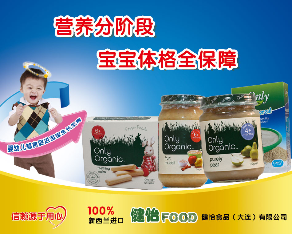 Onlyorganic(奧力)嬰幼兒有機食品,全部采用新西蘭本土新鮮的有機水果、蔬菜,經(jīng)新西蘭------有機食品體系現(xiàn)場監(jiān)督加工而成,非規(guī);a(chǎn),確保各批次產(chǎn)品質地純正、有據(jù)可查。再由先進的工業(yè)技術封閉罐裝,暢銷于南半球各大商超,成為新西蘭、澳大利亞等地區(qū)千萬媽媽喂養(yǎng)嬰幼兒的必須產(chǎn)品。近年來Onlyorgani(奧力)產(chǎn)品已經(jīng)聲名遠播,在新加坡、日本、韓國等亞太地區(qū)的發(fā)達國家已經(jīng)取得較好的銷量和口碑。