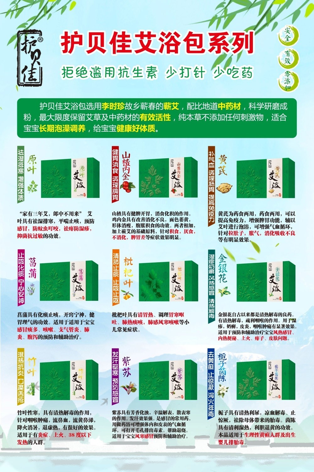 護(hù)貝佳貝愛——來自大自然的嬰幼兒健康護(hù)理品牌,以久負(fù)盛名的蘄艾和天然植物中草藥為原料,秉承“天然”、“安全”、“有效“、“零添加”的制造理念,倡導(dǎo)“少打針,少吃藥,杜絕抗生素”的健康理念,真正實(shí)現(xiàn)“健康育兒”的愿景,全面呵護(hù)寶寶的健康成長(zhǎng)。
