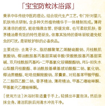 潤本草本防蚊沐浴露秉承中華傳統(tǒng)中醫(yī)藥理論,結(jié)合現(xiàn)代生產(chǎn)工藝,專門針對(duì)嬰兒肌膚特點(diǎn)研制,含多種天然植物精華于一體,精制而成。薄荷其清涼的感覺,能收縮微血管、舒緩發(fā)癢、也可柔軟肌膚;香茅精油有效特性是驅(qū)蟲,依靠其獨(dú)特的香味驅(qū)蚊,避免蚊蟲的叮咬,是驅(qū)蚊護(hù)膚的必備良品。