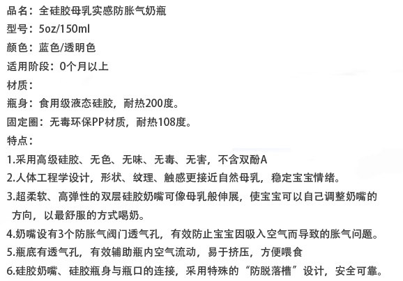 硅膠很柔軟,不用奶瓶刷用手也可以刷到奶瓶的各個角落,容易清洗。寶寶吸奶時,奶瓶會隨著奶水的減少而自動收縮,始終保持著瓶身內外氣壓一致,避免寶寶吸入過多的空氣而導致嗆奶、腹脹等不適,有效解決喂奶時脹氣的煩惱,從而達到自動呼吸的功能。