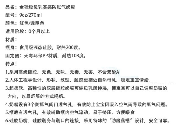 硅膠很柔軟,不用奶瓶刷用手也可以刷到奶瓶的各個角落,容易清洗。寶寶吸奶時,奶瓶會隨著奶水的減少而自動收縮,始終保持著瓶身內(nèi)外氣壓一致,避免寶寶吸入過多的空氣而導(dǎo)致嗆奶、腹脹等不適,有效解決喂奶時脹氣的煩惱,從而達到自動呼吸的功能。