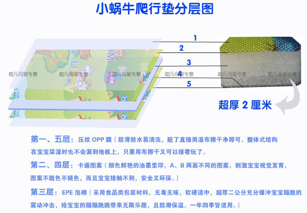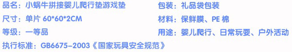 小蝸牛爬行墊無毒無味,防潮隔濕,超大無縫,表面附帶精美的童話圖案,從寶寶學爬到練習走路,再到大點在地上玩耍蹦跳,都是不錯的選擇,是寶寶健康快樂成長的好伴侶。