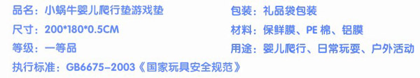 小蝸牛爬行墊無毒無味,防潮隔濕,超大無縫,表面附帶精美的童話圖案,從寶寶學(xué)爬到練習(xí)走路,再到大點在地上玩耍蹦跳,都是不錯的選擇,是寶寶健康快樂成長的好伴侶。