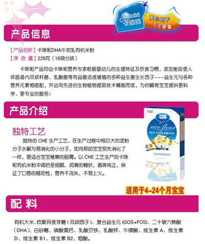 卡咪呢有機(jī)米粉系列是專為中國(guó)寶寶設(shè)計(jì)的營(yíng)養(yǎng)輔食,選用有機(jī)大米,科學(xué)搭配維生素AD等維生素,還特別添加;撬、DHA、AA等有助智力發(fā)育的營(yíng)養(yǎng)成分,富含15種營(yíng)養(yǎng)素,F(xiàn)上?ㄟ淠啬笅胗闷酚邢薰久嫦蛉珖(guó)空白市場(chǎng)區(qū)域誠(chéng)招卡咪呢有機(jī)米粉代理商。