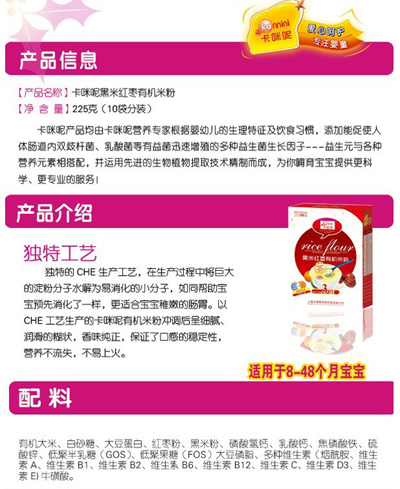 卡咪呢有機(jī)米粉系列是專為中國(guó)寶寶設(shè)計(jì)的營(yíng)養(yǎng)輔食,選用有機(jī)大米,科學(xué)搭配維生素AD等維生素,還特別添加牛磺酸、DHA、AA等有助智力發(fā)育的營(yíng)養(yǎng)成分,富含15種營(yíng)養(yǎng)素,F(xiàn)上?ㄟ淠啬笅胗闷酚邢薰久嫦蛉珖(guó)空白市場(chǎng)區(qū)域誠(chéng)招卡咪呢有機(jī)米粉代理商。