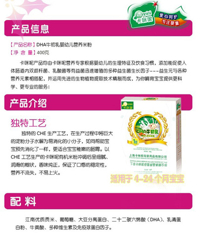 卡咪呢有機(jī)米粉系列是專為中國(guó)寶寶設(shè)計(jì)的營(yíng)養(yǎng)輔食,選用有機(jī)大米,科學(xué)搭配維生素AD等維生素,還特別添加牛磺酸、DHA、AA等有助智力發(fā)育的營(yíng)養(yǎng)成分,富含15種營(yíng)養(yǎng)素。現(xiàn)上?ㄟ淠啬笅胗闷酚邢薰久嫦蛉珖(guó)空白市場(chǎng)區(qū)域誠(chéng)招卡咪呢有機(jī)米粉代理商。