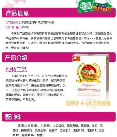 卡咪呢有機米粉系列是專為中國寶寶設計的營養(yǎng)輔食,選用有機大米,科學搭配維生素AD等維生素,還特別添加;撬、DHA、AA等有助智力發(fā)育的營養(yǎng)成分,富含15種營養(yǎng)素。現(xiàn)上?ㄟ淠啬笅胗闷酚邢薰久嫦蛉珖瞻资袌鰠^(qū)域誠招卡咪呢有機米粉代理商。