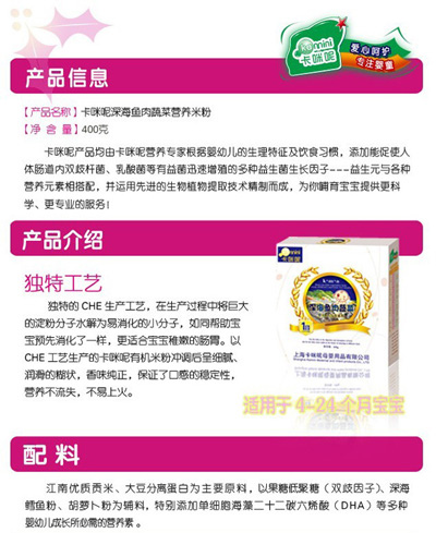 卡咪呢乳清蛋白嬰幼兒營養(yǎng)米粉是上?ㄟ淠啬笅胗闷酚邢薰酒煜庐a(chǎn)品,精選優(yōu)質(zhì)大米制作,特別添加乳清蛋白和益生元,提高寶寶抵抗力,促進(jìn)寶寶changdao的消化吸收,上市以來廣受父母消費(fèi)者的青睞。