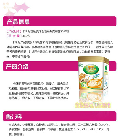 卡咪呢有機(jī)米粉系列是專為中國(guó)寶寶設(shè)計(jì)的營(yíng)養(yǎng)輔食,選用有機(jī)大米,科學(xué)搭配維生素AD等維生素,還特別添加;撬帷HA、AA等有助智力發(fā)育的營(yíng)養(yǎng)成分,富含15種營(yíng)養(yǎng)素,F(xiàn)上?ㄟ淠啬笅胗闷酚邢薰久嫦蛉珖(guó)空白市場(chǎng)區(qū)域誠(chéng)招卡咪呢有機(jī)米粉代理商。
