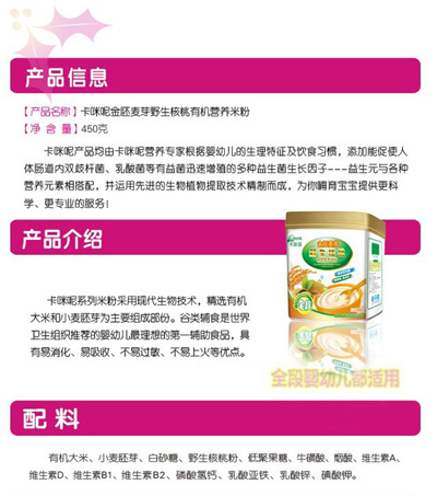 卡咪呢有機米粉系列是專為中國寶寶設計的營養(yǎng)輔食,選用有機大米,科學搭配維生素AD等維生素,還特別添加牛磺酸、DHA、AA等有助智力發(fā)育的營養(yǎng)成分,富含15種營養(yǎng)素,F(xiàn)上?ㄟ淠啬笅胗闷酚邢薰久嫦蛉珖瞻资袌鰠^(qū)域誠招卡咪呢有機米粉代理商。