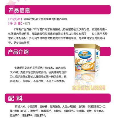 卡咪呢有機米粉系列是專為中國寶寶設計的營養(yǎng)輔食,選用有機大米,科學搭配維生素AD等維生素,還特別添加;撬帷HA、AA等有助智力發(fā)育的營養(yǎng)成分,富含15種營養(yǎng)素,F上?ㄟ淠啬笅胗闷酚邢薰久嫦蛉珖瞻资袌鰠^(qū)域誠招卡咪呢有機米粉代理商。