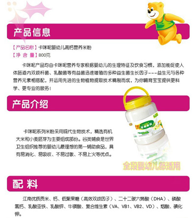 卡咪呢有機(jī)米粉系列是專為中國寶寶設(shè)計(jì)的營養(yǎng)輔食,選用有機(jī)大米,科學(xué)搭配維生素AD等維生素,還特別添加牛磺酸、DHA、AA等有助智力發(fā)育的營養(yǎng)成分,富含15種營養(yǎng)素,F(xiàn)上海卡咪呢母嬰用品有限公司面向全國空白市場(chǎng)區(qū)域誠招卡咪呢有機(jī)米粉代理商。