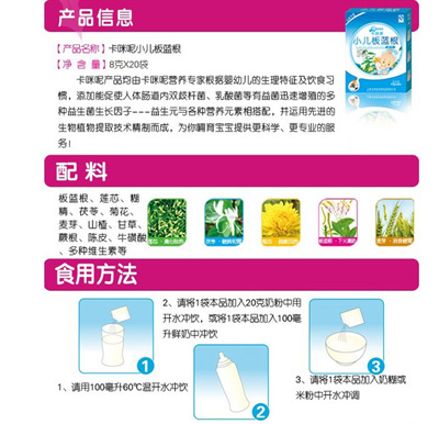 卡咪呢有機米粉系列是專為中國寶寶設計的營養(yǎng)輔食,選用有機大米,科學搭配維生素AD等維生素,還特別添加;撬、DHA、AA等有助智力發(fā)育的營養(yǎng)成分,富含15種營養(yǎng)素,F(xiàn)上?ㄟ淠啬笅胗闷酚邢薰久嫦蛉珖瞻资袌鰠^(qū)域誠招卡咪呢有機米粉代理商。