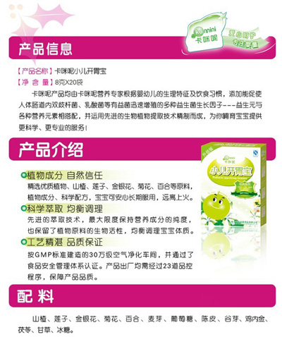 卡咪呢小兒板藍(lán)根顆粒是上?ㄟ淠啬笅胗闷酚邢薰酒煜庐a(chǎn)品,專為嬰幼兒設(shè)計(jì),專業(yè)、安全,幫助寶寶可以預(yù)防感冒抵抗病毒,是廣大父母育兒的好幫手?ㄟ淠匦喊逅{(lán)根顆粒不含任何色素、防腐劑,安全放心。