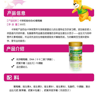 卡咪呢維他命AD葡萄糖是上?ㄟ淠啬笅胗闷酚邢薰镜闹鞔虍a(chǎn)品,上?ㄟ淠啬笅胗闷酚邢薰臼冀K認(rèn)為,品質(zhì)是給廣大客戶的zui好承諾,所以,上海卡咪呢母嬰用品有限公司堅(jiān)持以質(zhì)量為中心,全心全意為客戶服務(wù),卡咪呢維他命AD葡萄糖質(zhì)量上乘,品質(zhì)保證,現(xiàn)面向全國(guó)各地空白區(qū)域招商,歡迎各地行業(yè)人士前來(lái)咨詢,上海卡咪呢母嬰用品有限公司真誠(chéng)為您服務(wù)!