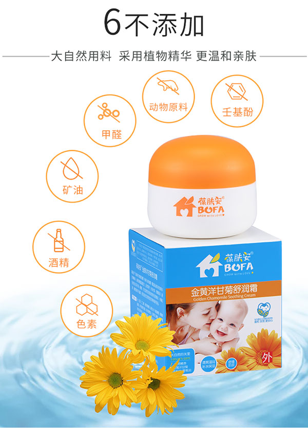 葆膚安金黃洋甘菊舒潤霜,一款為寶寶嬌嫩肌膚所研發(fā)設(shè)計的專業(yè)護膚產(chǎn)品,精選洋甘菊等多重植物精粹,更含有橄欖油、山茶籽油等成分,不含色素、酒精、甲醛,安全健康。