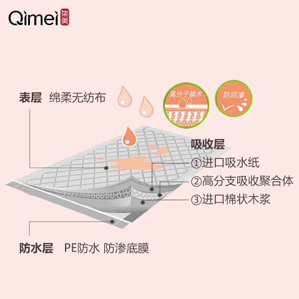 柒美產(chǎn)后護理墊巾為醫(yī)用消毒產(chǎn)品,表層柔軟透氣,防止回滲,保護肌膚干爽自然。中層采用混合式的高分子吸水絨毛漿吸收結(jié)構(gòu),凝聚快速充分。透氣PE膜設計,排氣孔不間斷工作,摒棄悶熱,告別潮濕,舒爽每一天。
