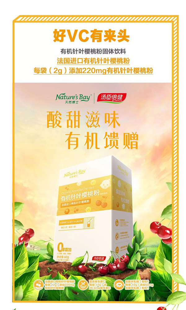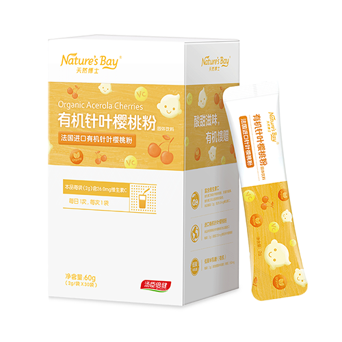 主要原料:本品每袋(2g)含26.0mg維生素C,本品所用有機針葉櫻桃粉粉為法國進口,每袋(2g)添加220mg有機針葉櫻桃粉,每袋(2g)添加低聚半乳糖(有機)50mg