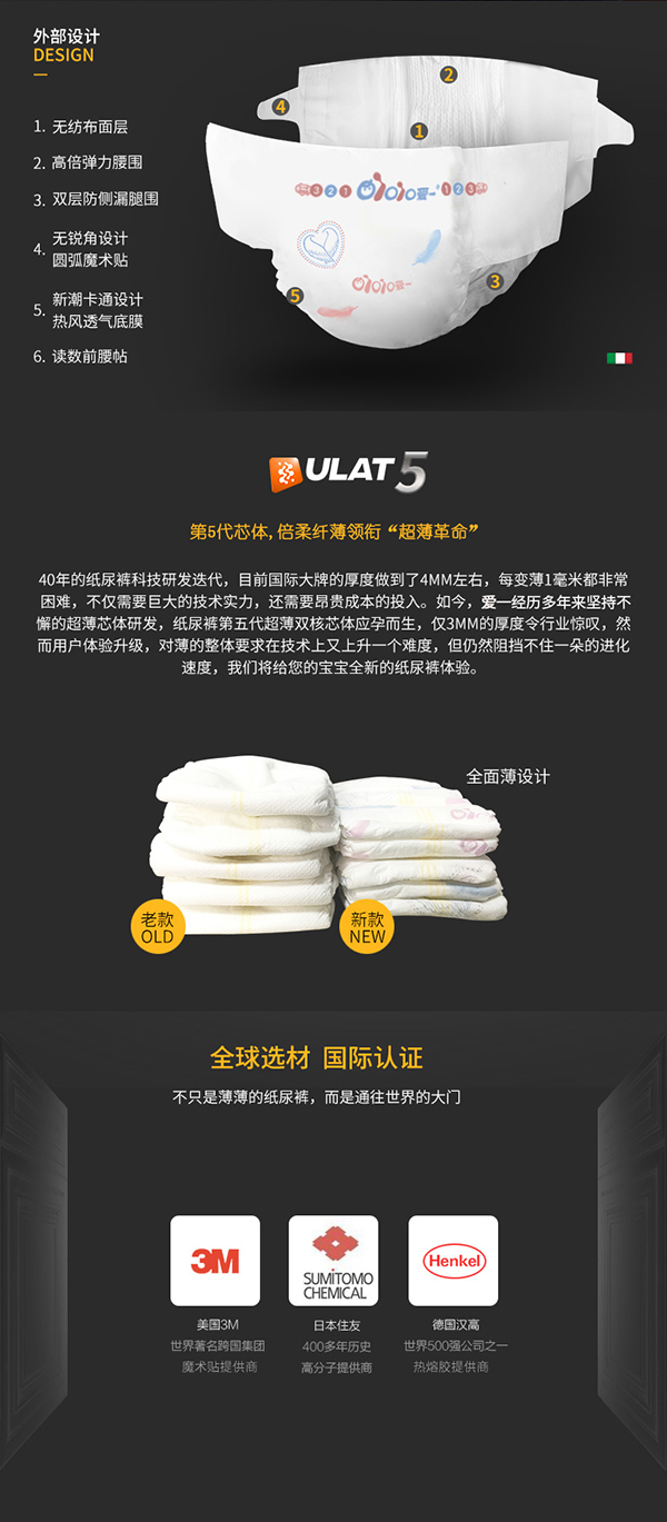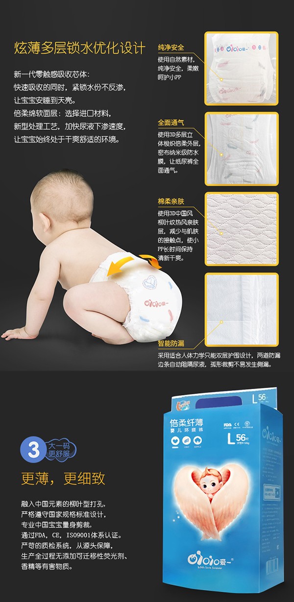 愛(ài)一唯愛(ài)系列紙尿褲,精選綿柔材料,絲綢般柔軟,猶如云朵般舒適,呵護(hù)幼嫩肌膚,媽媽更安心;全芯體設(shè)計(jì),纖薄柔軟,高能吸水分子,瞬間吸收,持久鎖濕,不反滲,表層時(shí)刻干爽。