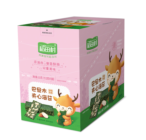 稻田村夾心海苔,鮮香酥脆,雙重美味。不加食品添加劑;不加醬油、不加味精;不加食用油,烘焙非油炸;選用品質(zhì)紫菜,色澤自然墨綠,片薄均勻,鮮嫩有光澤,有紫菜本身的清香;科學搭配紫菜與酥脆夾心的比例,甜度適中,口感鮮香。