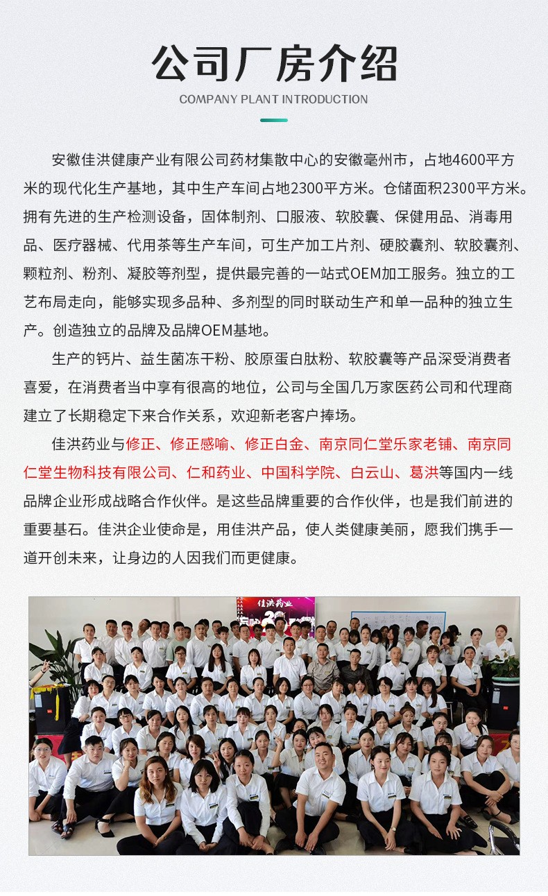 安徽佳洪健康產(chǎn)業(yè)有限公司位于全球最大的中藥材集散中心安徽亳州市,占地4600平方的現(xiàn)代化生產(chǎn)基地,其中生產(chǎn)車間占地2300平。倉儲面積2300平。國際先進(jìn)的生產(chǎn)檢測設(shè)備,固體制劑、口服液、軟膠囊、保健用品、消毒用品、醫(yī)療器械、代用茶等生產(chǎn)車間,可生產(chǎn)加工片劑、硬膠囊劑、軟膠囊劑、顆粒劑、粉劑、凝膠等劑型,提供最完善的一站式OEM加工服務(wù)。獨(dú)立的工藝布局走向,能夠?qū)崿F(xiàn)多品種、多劑型的同時聯(lián)動生產(chǎn)和單一品種的獨(dú)立生產(chǎn)。創(chuàng)造獨(dú)立的品牌及品牌OEM基地。