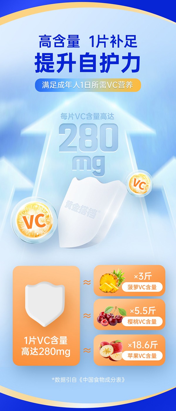 黃金搭檔黃金維生素C含片,藍帽保健食品,品質(zhì)更放心!根據(jù)成人群體日常VC需求精心研制,守護健康更給力!每片含維生素C 280mg,滿滿VC,滿滿能量!科學(xué)配比,工藝精湛,營養(yǎng)成分更好吸收!純正甜橙口味,酸甜口感,暢享健康!