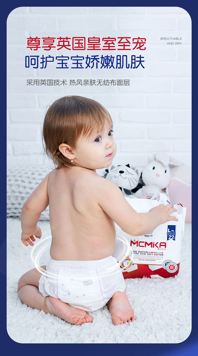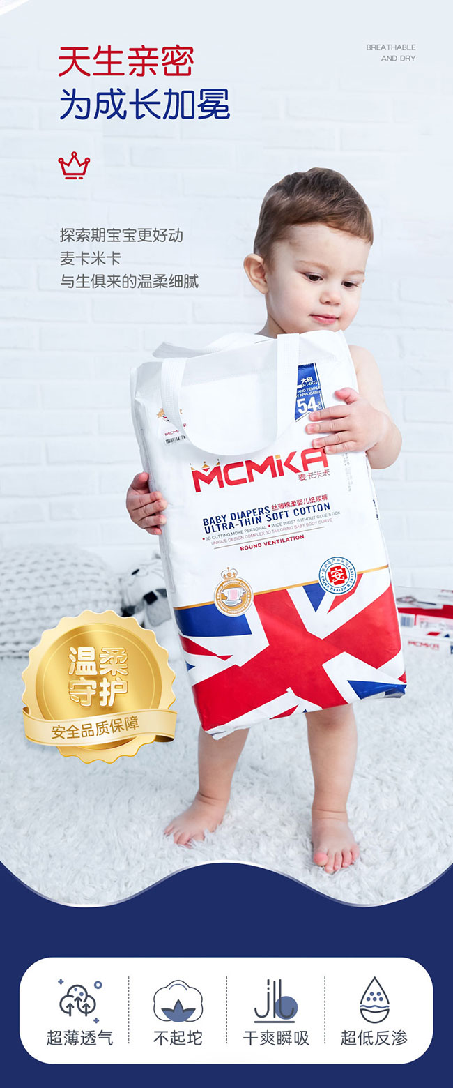 麥卡米卡絲薄棉柔嬰兒紙尿褲,超薄綿柔,天生親密,為成長(zhǎng)加冕;透氣干爽,超彈護(hù)腰,醫(yī)護(hù)級(jí)認(rèn)證,品質(zhì)更放心 。