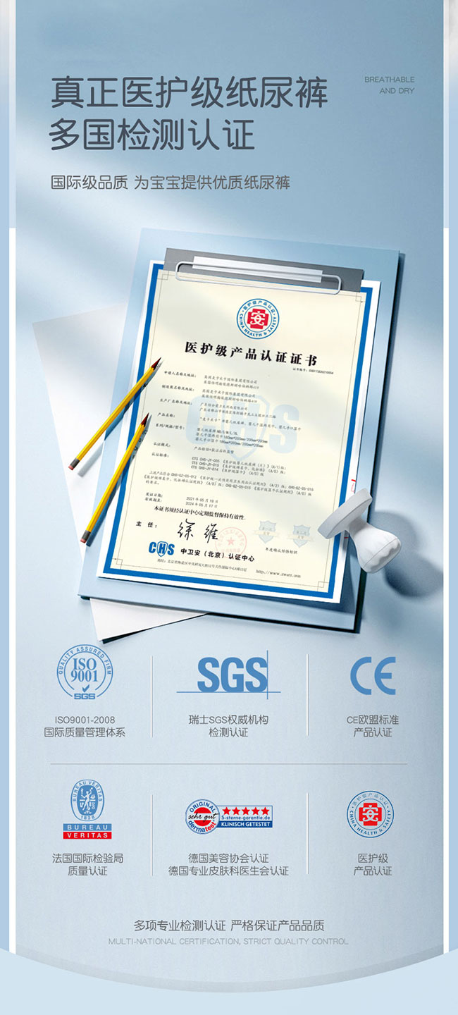 它的 “硬核” 首先藏在認(rèn)證里。作為醫(yī)護(hù)級(jí)紙尿褲,它通過了多國檢測(cè)認(rèn)證,從原料到生產(chǎn)都經(jīng)過嚴(yán)格把控,給寶寶的守護(hù)多了一層專業(yè)保障,寶媽選的時(shí)候不用再反復(fù)對(duì)比成分表,省心又安心。