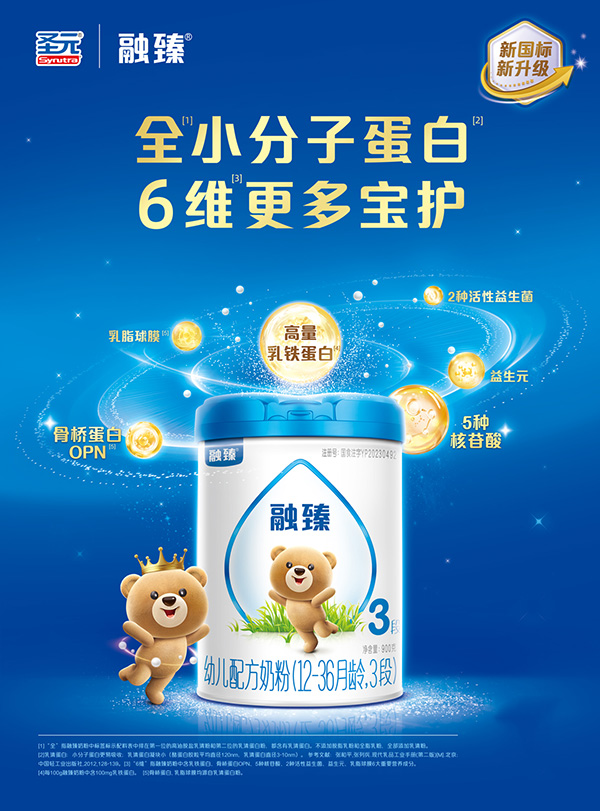 圣元融臻新國標(biāo)奶粉采用的是全乳清蛋白配方,乳清蛋白的含量高達(dá)90%以上,乳酪比9:1,與初乳蛋白的比例保持一致,好消化,易吸收!針對寶寶生長發(fā)育的需求,特別添加了6維寶護(hù)因子,每100g添加乳鐵蛋白100mg、益生元3100mg、50mg的5種核苷酸;另外還添加了2種活性益生菌,乳脂球膜以及骨橋蛋白OPN,6重保護(hù)因子,助力寶寶擁有超強(qiáng)的自護(hù)力。