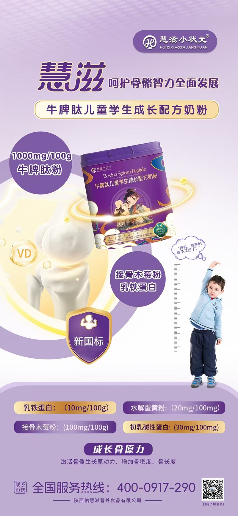 想要孩子長(zhǎng)得好,又聰明,那么,在生長(zhǎng)發(fā)育過程中,需要補(bǔ)充多種關(guān)鍵營(yíng)養(yǎng),那么,怎么補(bǔ)充呢??jī)和谭凼且粋(gè)好選擇。針對(duì)兒童的特別營(yíng)養(yǎng)需求,陜西佑慧滋營(yíng)養(yǎng)食品有限公司匠心推出了“慧滋小狀元兒童成長(zhǎng)配方奶粉”,為兒童補(bǔ)充足夠的營(yíng)養(yǎng),為成長(zhǎng)助力。
