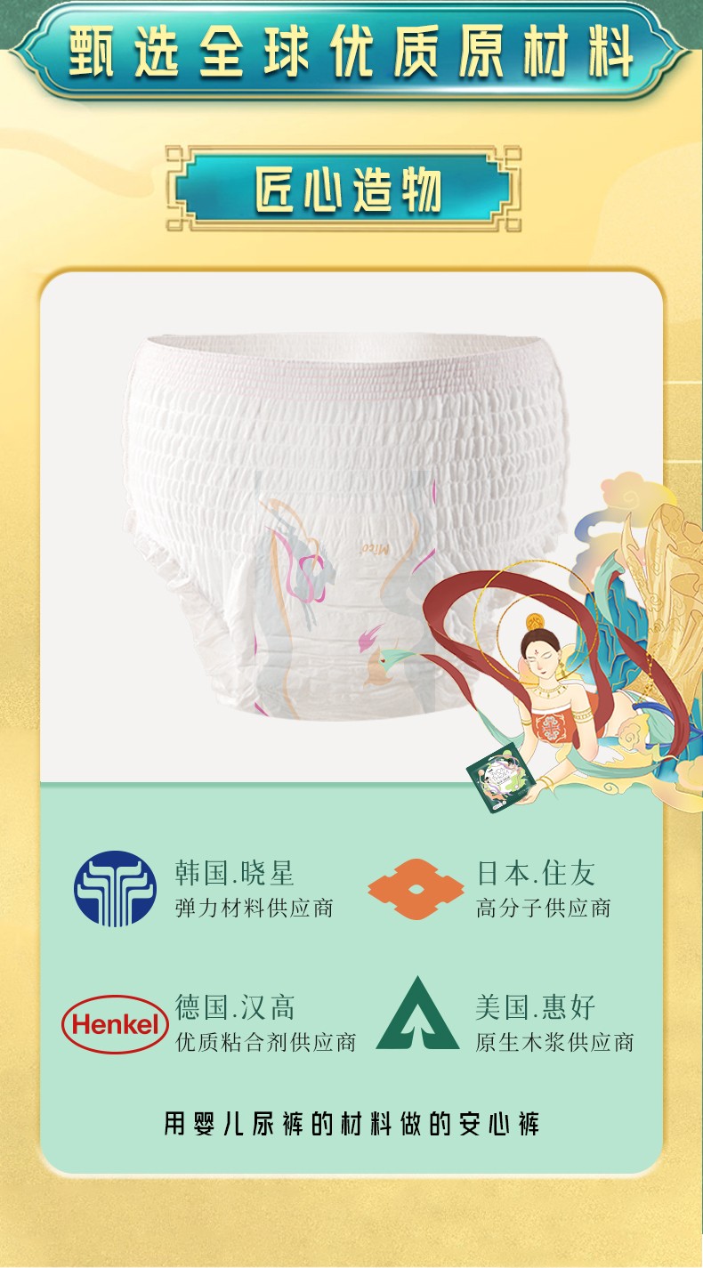 米可隨心悅動·安心褲,主要成分:無紡布、氨綸絲、SAP吸收芯體。0.2cm,輕薄透氣,整夜舒爽。立體環(huán)吸芯體,高倍鎖住潮涌,瞬吸舒爽。360°環(huán)抱貼身設計,彈力伸縮,雙向防漏,不束縛。親膚面層,輕盈無負擔,薄的剛剛好。每片都是獨立包裝,干凈便攜。