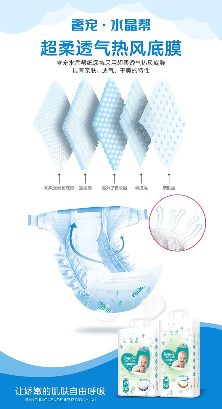 貝嬌兒奢寵水晶幫拉拉褲,采用超柔透氣熱風(fēng)底膜,具有親膚、透氣、干爽的特點(diǎn)。親膚棉柔面層,呵護(hù)嬌嫩肌膚;0.1cm纖薄,輕薄無(wú)負(fù)擔(dān);進(jìn)口高分子,小身材大吸量;約50000個(gè)呼吸微孔,空氣循環(huán)暢通,透氣干爽,遠(yuǎn)離紅屁屁。凸點(diǎn)設(shè)計(jì),減少接觸面,及時(shí)散發(fā)悶熱潮氣。超柔超薄空氣芯,全方位瞬吸導(dǎo)流,拒絕鼓包,拒絕斷層,多次尿量,一片瞬吸,鎖住尿液不回滲,屁屁拒絕潮濕,整晚安睡。