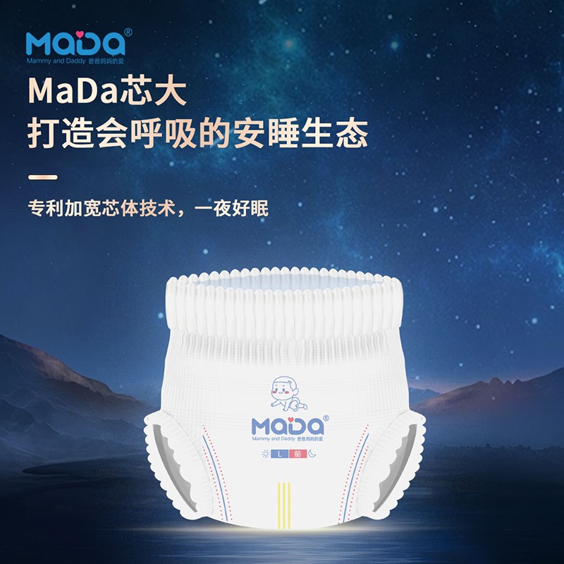 MaDa芯大系列褲型嬰兒紙尿褲,芯大20%,不漏好安心。薄若蟬翼,隔濕透氣,泡點觸膚,干爽舒適,云朵腰圍,柔軟不勒,芯體加寬,瞬吸瞬干。