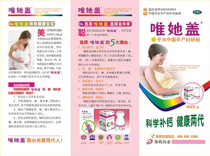唯她蓋是湖北名珠藥業(yè)有限公司旗下的品牌,唯她蓋主要服務(wù)于婦幼保健,國家藥監(jiān)局批準(zhǔn)上市,安全可靠。唯她蓋獨(dú)具有機(jī)鈣和無機(jī)鈣雙重鈣源(葡萄糖酸鈣+磷酸氫鈣)和三大成長維生素(VD2、VB1、VB2)的黃金配比,是最適合孕婦和哺乳期婦女的補(bǔ)鈣制劑。唯她蓋所含鈣、磷、多種維生素黃金搭配,組方更易轉(zhuǎn)化,益于寶寶骨骼成長。唯她蓋咀嚼片口感好,嚼著吃,方便,吸收快。唯她蓋瓶體采用壓旋蓋設(shè)計,密閉性、安全性高,兒童不易打,確保藥品不受外界污染。唯她蓋由邦琪藥業(yè)集團(tuán)的總廠生產(chǎn)市。采用最高等級原料藥,集團(tuán)總工全程嚴(yán)格控制生產(chǎn)工藝流程,確保每一片唯她蓋的最高品質(zhì)。