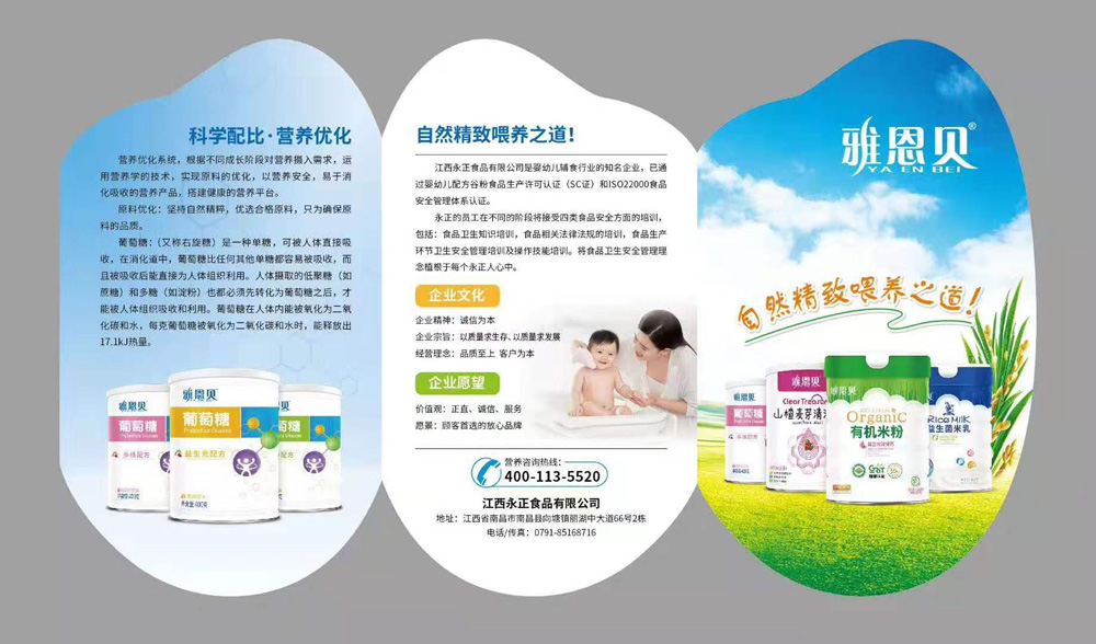 “雅恩貝”是江西永正食品有限公司旗下主打品牌,公司成立于2016年5月26日,是國(guó)家制定新政后的新型嬰幼兒輔食企業(yè)。企業(yè)已經(jīng)通過(guò)嬰幼兒配方谷粉食品生產(chǎn)許可證(證號(hào):SC10636012111666)和ISO22000食品安全體系認(rèn)證。本著“專業(yè)執(zhí)著,精益求精”的工作原則,秉承“品質(zhì)至上,客戶為本”經(jīng)營(yíng)理念,研制生產(chǎn)了適合嬰幼兒健康營(yíng)養(yǎng)需要的米粉類,清火寶類,葡萄糖類等系列產(chǎn)品。