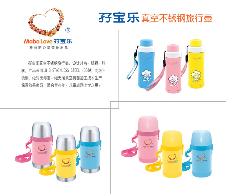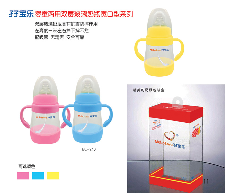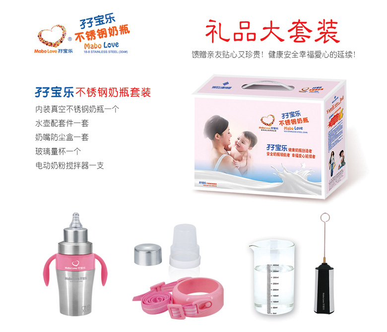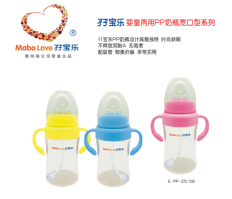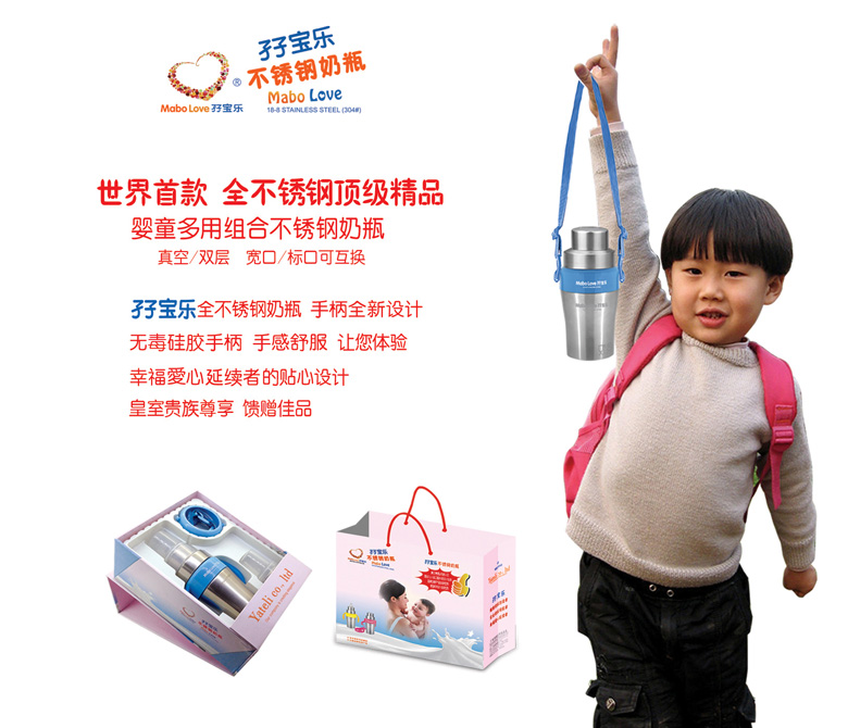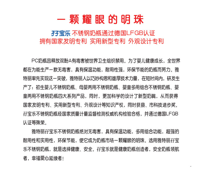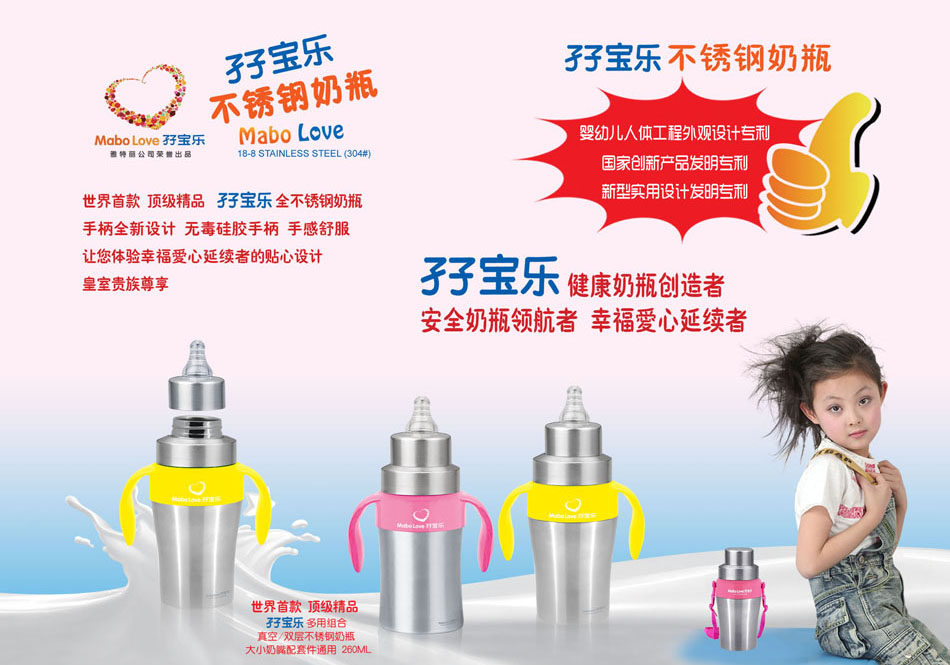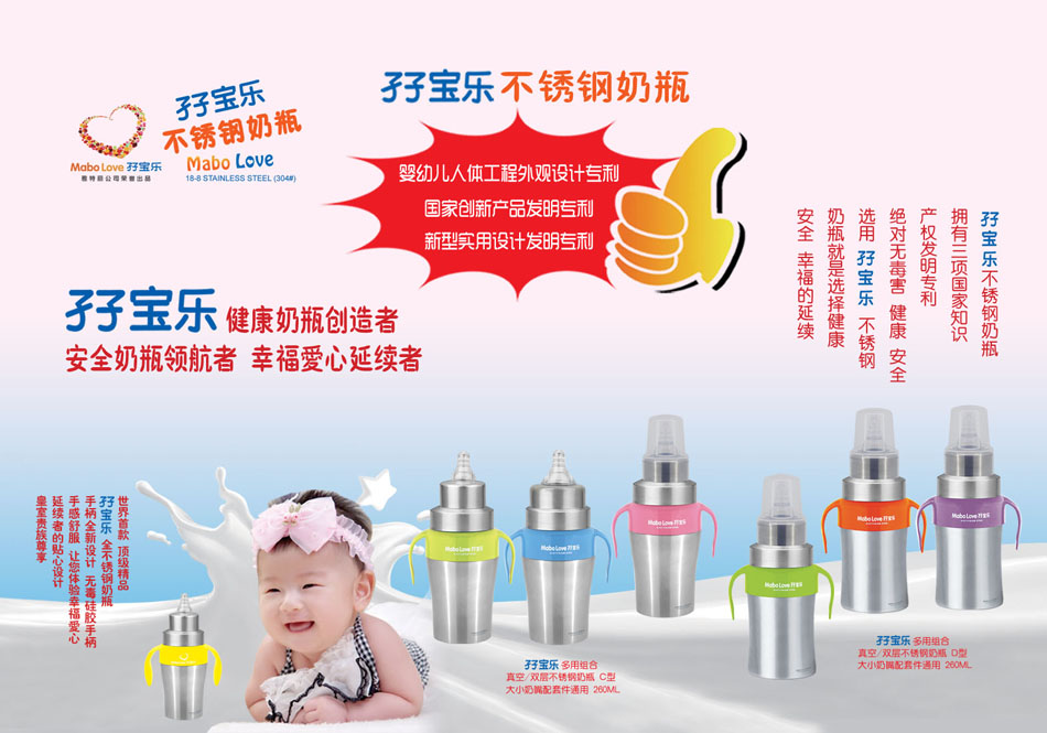 孖寶樂是雅特麗公司旗下孕嬰童用品注冊商標(biāo),孖寶樂不銹鋼奶瓶擁有國家創(chuàng)新產(chǎn)品發(fā)明專利,新型實(shí)用設(shè)計(jì)發(fā)明專利,嬰幼兒人體工程外觀設(shè)計(jì)專利三項(xiàng)國家知識(shí)產(chǎn)權(quán)發(fā)明專利。孖寶樂就是健康奶瓶創(chuàng)造者,安全奶瓶領(lǐng)航者,幸福愛心延續(xù)者。與其它奶瓶自然形成差異化,堅(jiān)信它具有非常市場潛力,誠邀有識(shí)之士,共同開拓廣闊市場,共創(chuàng)雙贏。