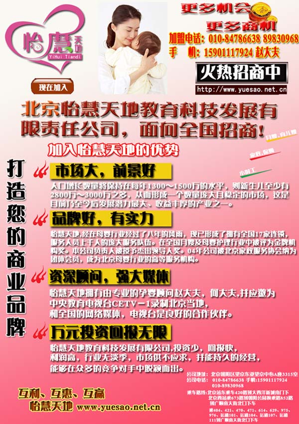 北京怡慧天地教育科技發(fā)展有限責任公司是一家集婦幼保健咨詢和母嬰服務為一體的專業(yè)性服務機構。主要提供孕產期保健咨詢和母嬰護理服務,并致力于嬰幼兒科學養(yǎng)育和早期教育的研究。公司聘請了多年從事婦幼保健工作和教育工作的資深人士擔當顧問,由畢業(yè)于著名醫(yī)科大學的婦幼專家主持,擁有一支經驗豐富的高素質管理人員和母嬰護理服務人員的隊伍。