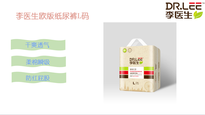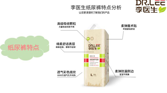 李醫(yī)生紙尿褲是李醫(yī)生的拳頭產(chǎn)品,面層、芯體、底膜均采用高端材質(zhì),質(zhì)量在市場(chǎng)上占有絕對(duì)優(yōu)勢(shì)。產(chǎn)品特點(diǎn)是干爽、柔軟、透氣、吸水性好,同時(shí)具有不斷層、不起陀等特點(diǎn),能夠給寶寶最舒適得體驗(yàn)。