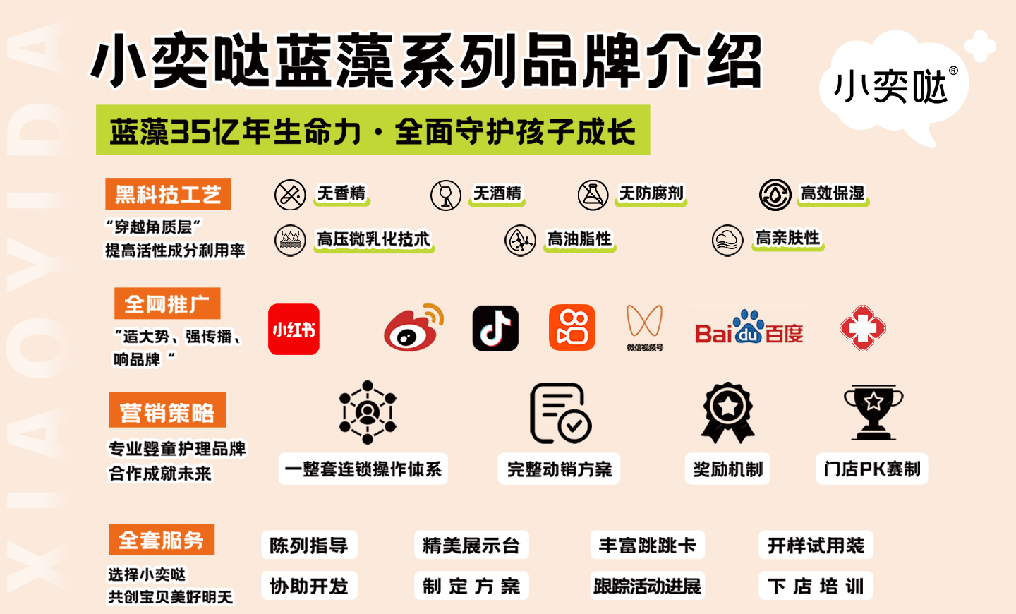 品牌名稱:小奕噠 主營產(chǎn)品:小奕噠嬰童護膚招商 品牌特色:安全 天然 滋養(yǎng)
