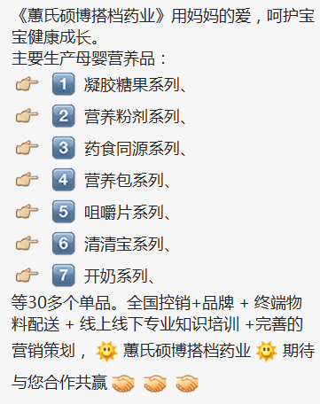 主要生產(chǎn)母嬰營(yíng)養(yǎng)品︰凝膠糖果系列、營(yíng)養(yǎng)粉劑系列、藥食同源系列、營(yíng)養(yǎng)包系列、咀嚼片系列、清清寶系列、開(kāi)奶系列等30多個(gè)單品。全國(guó)控銷+品牌+終端物料配送+線上線下專業(yè)知識(shí)培訓(xùn)+完善的營(yíng)銷策劃,蕙氏碩博搭檔藥業(yè),期待與您合作共贏。