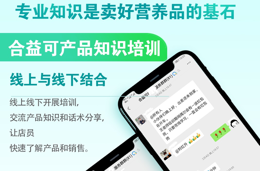 作為一個(gè)專(zhuān)業(yè)營(yíng)養(yǎng)品品牌,深知專(zhuān)業(yè)性對(duì)家庭健康的重要性,更是門(mén)店?duì)I養(yǎng)品銷(xiāo)售的核心,門(mén)店與客戶(hù)信任與忠誠(chéng)的紐帶,再好的營(yíng)養(yǎng)品,離不開(kāi)專(zhuān)業(yè)的服務(wù),合益可商學(xué)院應(yīng)運(yùn)而生——提升合作門(mén)店專(zhuān)業(yè)度。通過(guò)線上線下知識(shí)培訓(xùn)的開(kāi)展,讓合作門(mén)店從最初的產(chǎn)品認(rèn)知到相關(guān)營(yíng)養(yǎng)品知識(shí)學(xué)習(xí),從單一產(chǎn)品的專(zhuān)業(yè)知識(shí)到母嬰護(hù)理全面營(yíng)養(yǎng)知識(shí)學(xué)習(xí)。