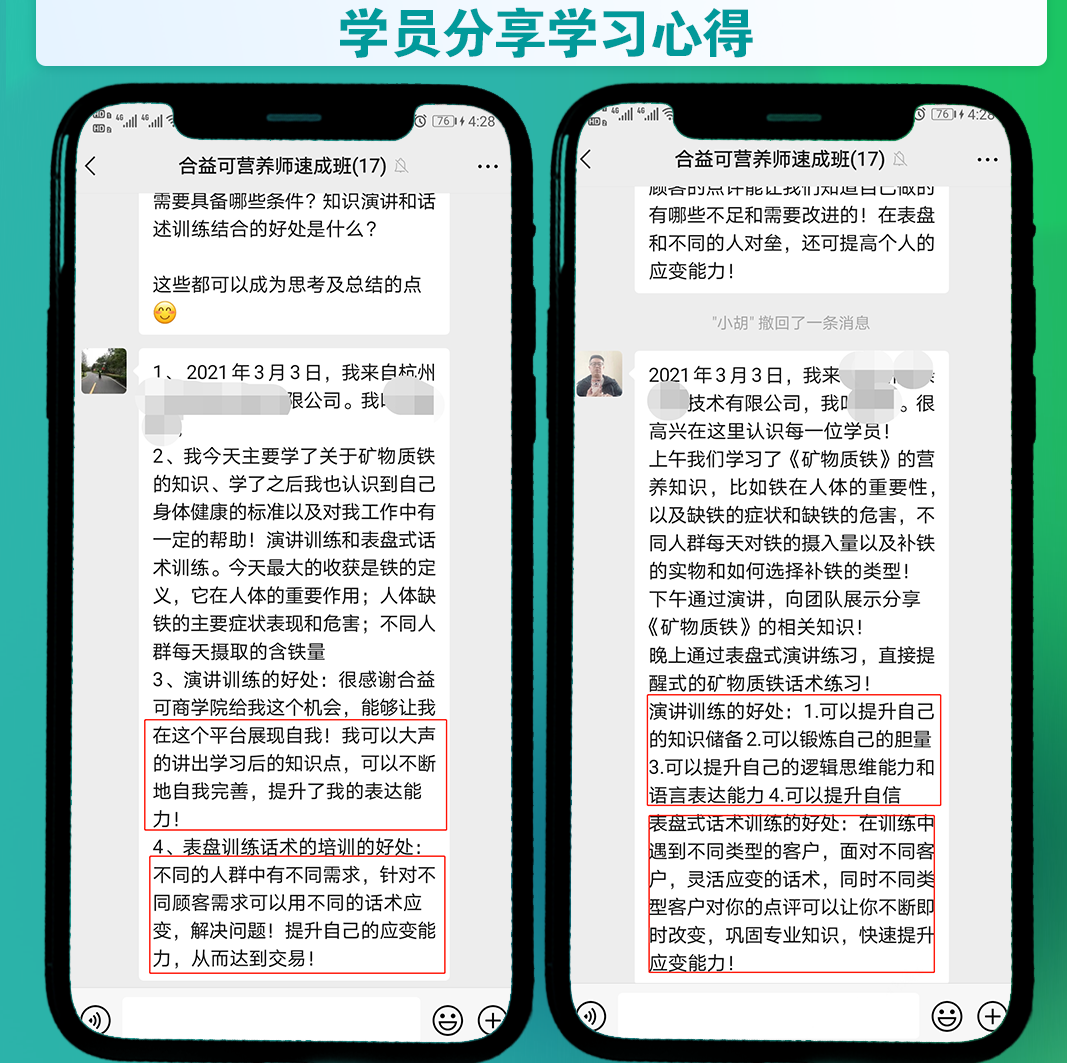 合益可商學(xué)院致力于幫助打造門(mén)店?duì)I養(yǎng)師,區(qū)域內(nèi)開(kāi)設(shè)營(yíng)養(yǎng)師培訓(xùn)班,分別根據(jù)經(jīng)銷(xiāo)商和終端門(mén)店的業(yè)務(wù)人員和營(yíng)養(yǎng)師做對(duì)應(yīng)的專(zhuān)業(yè)培訓(xùn),幫助代理商打造專(zhuān)業(yè)的業(yè)務(wù)人員和營(yíng)養(yǎng)師,更好的服務(wù)終端門(mén)店;幫助門(mén)店打造專(zhuān)業(yè)的店員或店長(zhǎng),更好的服務(wù)消費(fèi)者。這類(lèi)培訓(xùn)最大的特色就在于將學(xué)習(xí)的內(nèi)容與實(shí)戰(zhàn)結(jié)合,主張“多學(xué)不如多練”,通過(guò)將所學(xué)內(nèi)容演講訓(xùn)練和對(duì)講訓(xùn)練,真正做到學(xué)以致用,并且根據(jù)演練過(guò)程中多種角色演練,讓學(xué)員根據(jù)不同類(lèi)型的客戶(hù),靈活應(yīng)變?cè)捫g(shù),快速提升應(yīng)變能力。